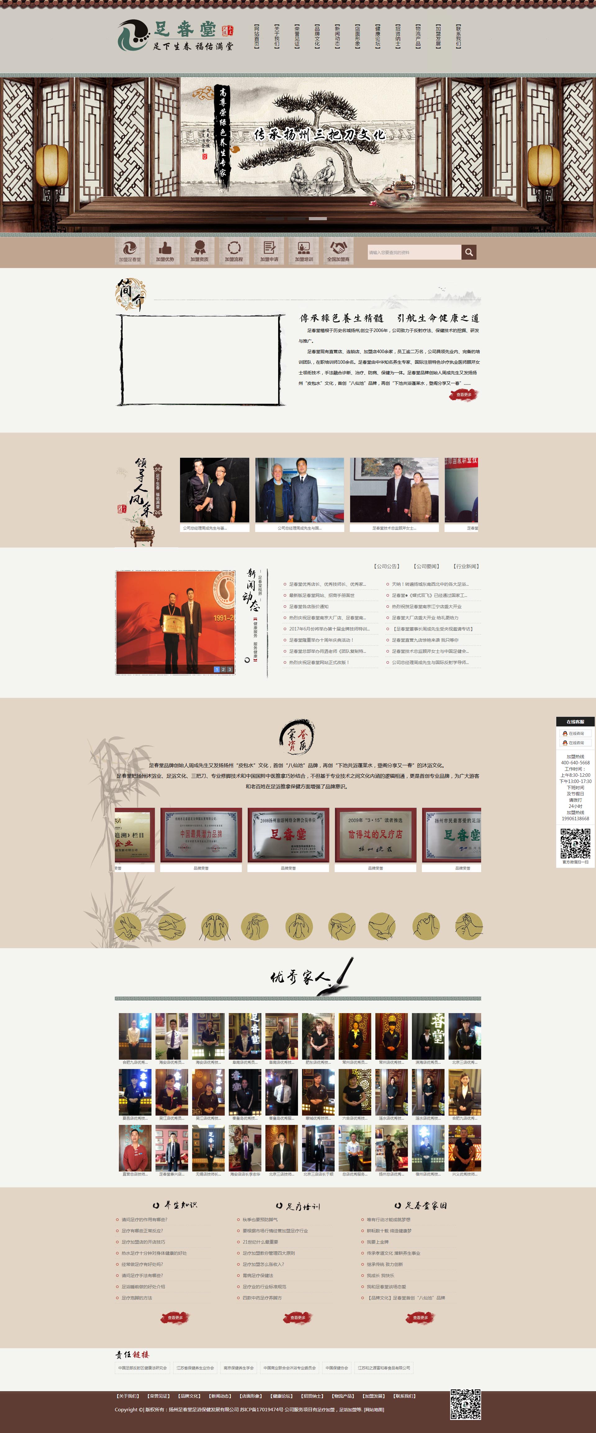 揚州足春堂足浴保健發(fā)展有限公司 足春堂植根于歷史名城揚州創(chuàng)立于2006年,公司致力于反射療法、保健技術的挖掘、研發(fā)與推廣。足春堂現(xiàn)有直營店、連鎖店、加盟店400余家,員工逾二萬名,公司具領先業(yè)內、完備的培訓團隊,在職培訓師100余名。足春堂由中華知名養(yǎng)生專家、國際注冊特色診療執(zhí)業(yè)醫(yī)師顧芹女士領銜技術,手法融合診斷、治療、防病、保健為一體。足春堂品牌創(chuàng)始人周成先生又發(fā)揚揚州“皮包水”文化,首創(chuàng)“八仙池”品牌,再創(chuàng)“下池共浴蓬萊水,登閣分享又一春”的沐浴文化。 查看網(wǎng)站Service
